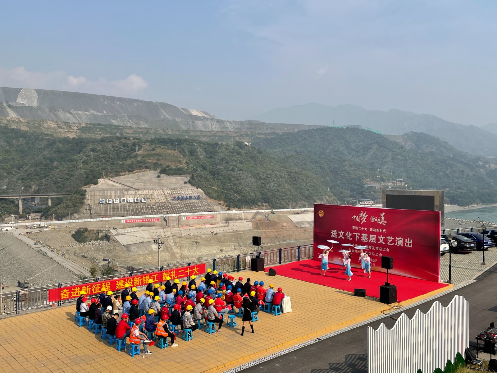10月19日上午,黨的二十大勝利召開之際,由攀枝花市總工會主辦、東區(qū)總工會承辦、攀水電公司工會協(xié)辦的“中國夢·勞動美——喜迎二十大、建功新時代”文藝演出在銀江水電站七色陽光大黨建宣傳陣地拉開帷幕。攀水電黨總支副書記、董事會秘書、工會主席鄧勇、副總經(jīng)理唐伽、攀新能源公司總經(jīng)理助理王鵬志等出席了本次活動。按疫情防控要求,長江設(shè)計公司、貴陽院監(jiān)理、二灘建設(shè)監(jiān)理、華東院監(jiān)理、水電五局、水電七局、水電十局、四川路橋、實驗中心等參建單位的40余名職工代表現(xiàn)場觀看演出。